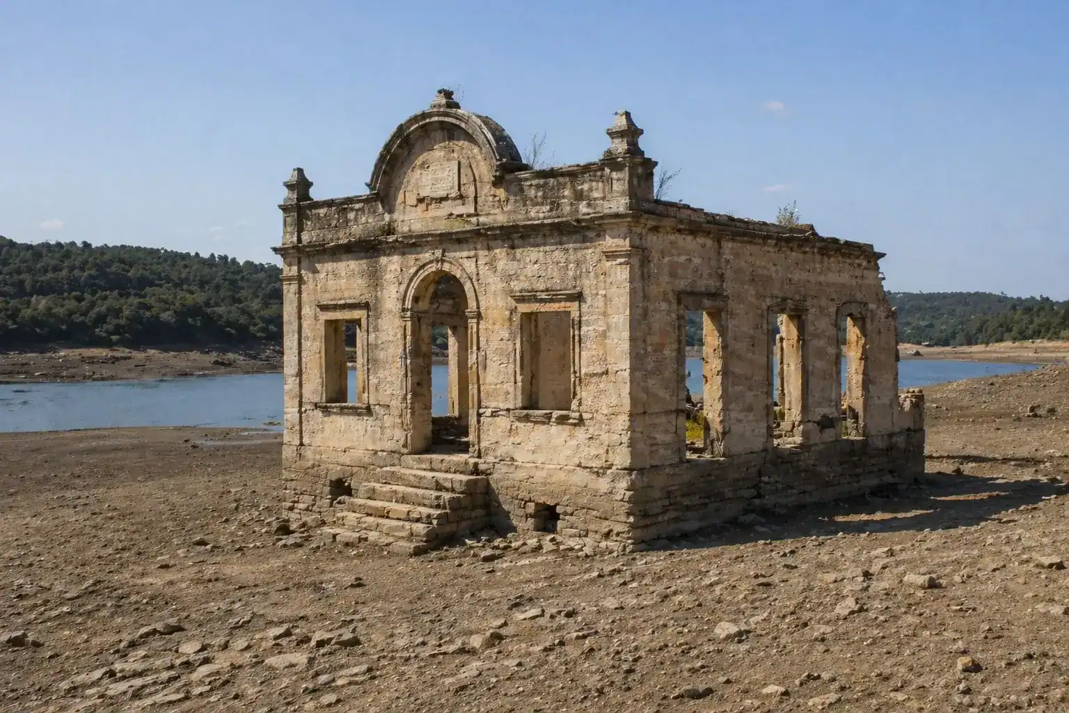 La construcción que más atrae la atención de los visitantes es la vieja iglesia matriz. Aunque el tejado y las maderas han desaparecido tras décadas bajo el agua, las columnas y los arcos principales siguen en pie. Este monumento emergido se ha convertido en un punto de referencia para buceadores, historiadores y aficionados a la arqueología industrial, ansiosos por explorar los vestigios de un pasado subacuático. El silencio en estas ruinas solo se rompe con el susurro del viento en el valle ahora expuesto.